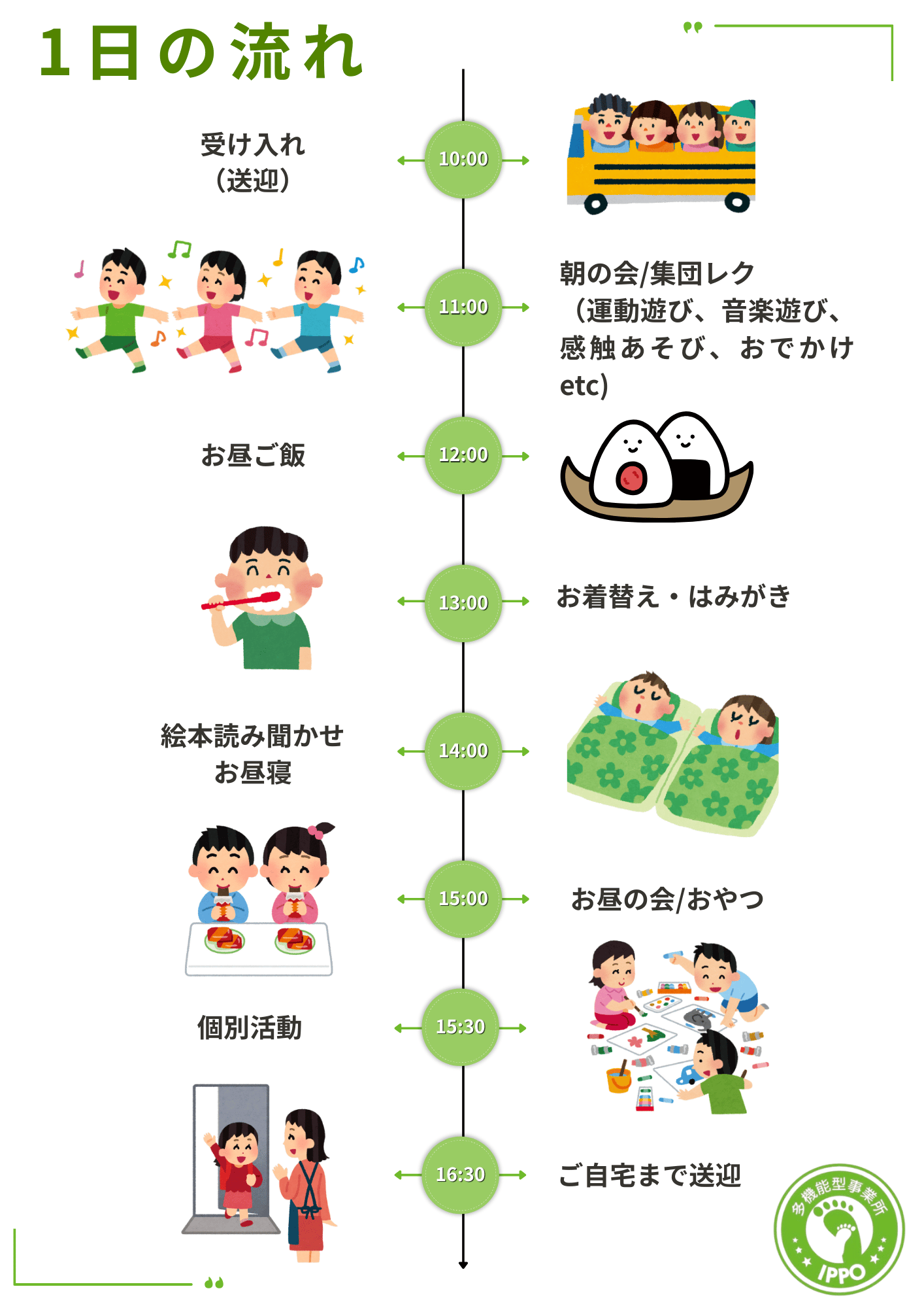 サービス提供時間は10:00〜16:30と、1日を通してお預かりします。これまで「児童発達支援は午前中で終わるから職場復帰できない」と諦めていたご家族の就労や家事等の時間をバックアップします。